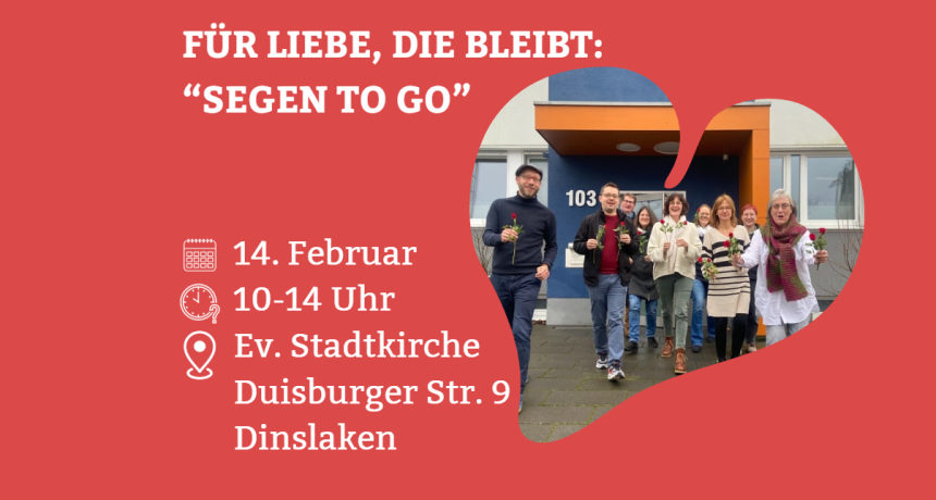 Unter dem Motto „Für Liebe, die bleibt – Segen to go“ laden die Pfarrerinnen und Pfarrer der menschenskirche (Evangelischer Kirchenkreis Dinslaken) am 14. Februar, am Valentinstag, alle Liebespaare wieder herzlich zur besonderen Segensaktion ein.