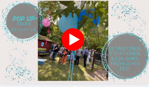 Insgesamt gab es 7 unterschiedliche Taufstationen: ein Taufort mit Beachflair – Sand und Planschbecken inbegriffen. Eine Station war auf einen kleinen Hügel von Bäumen umgeben. Wer mochte, konnte sich auch in einer Badewanne taufen lassen. Im Garten hinter dem Gemeindehaus war extra eine Station für diejenigen aufgebaut, die eine ruhigere Taufe vorgezogen hatten. Dort konnten es sich die Täuflinge und Gäste auf bunten Kissen bequem machen. Natürlich konnte man sich auch klassisch in der Kirche taufen lassen. Der beliebteste Ort war allerdings die Taufstation am Rotbach. Dort war ein Rosenbogen vor dem Taufbecken aufgebaut, um das sich der Täufling und die Familien versammelten.